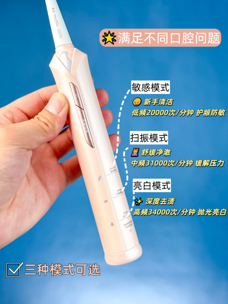 扫振模式(31,000次/分钟):中频震动与招牌扫振的黄金组合,清洁力与温和度兼得,适合每日安心使用。