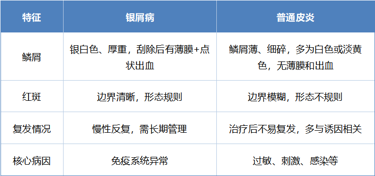 银屑病是一种慢性、免疫相关性皮肤病,核心误区就是“把它当成普通皮炎”,两者本质完全不同,先做好区分,才能避免盲目用药: