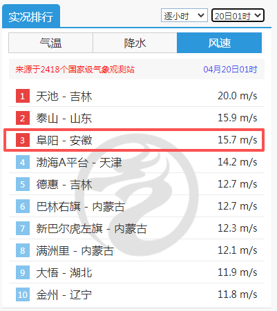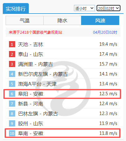 中央气象台数据显示,今天凌晨1时,阜阳风速15.7m/s,位列该时段全国第三。