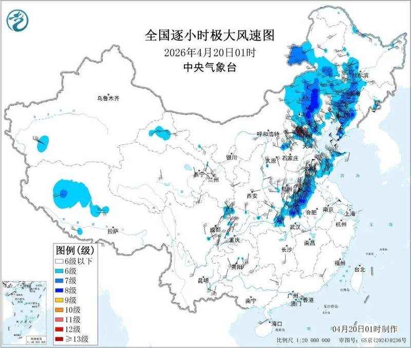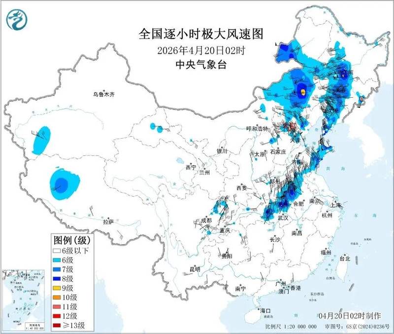 安徽省极大风力分布图显示,2026年4月19日08时-20日08时: