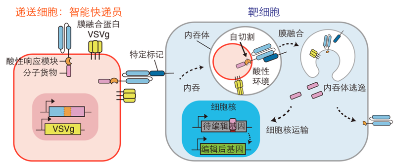 沿着酸性环境这条线索,他们又找到了一段会在酸性条件下自动切割的氨基酸序列,并把它接到了想递送的目标蛋白质上。这样一来,当这些蛋白质随着胞啃进入目标细胞内部、到达早期溶酶体后,就会在酸性环境中从膜上脱落,再借助VSVG逃离至目标细胞的细胞质乃至细胞核。陈心怡把这个过程形容为“坐缆车”:递送的蛋白质先借由胞啃进入目标细胞,然后在溶酶体里下车,最终去往自己真正该去的地方。