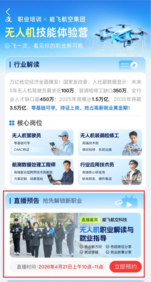 想轻松搭上低空经济这班车?支付宝×能飞航空特别推出无人机职业解读与就业指导线上直播。免费带你看实操演示、讲清执照怎么考、分享行业真实前景,还有平台专属福利一次领齐。