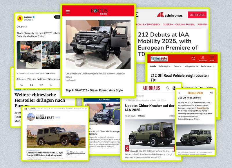 在海外,212越野车露出频次显著提升,先后登陆慕尼黑车展、SEMA改装展等国际展会。其T01柴油版车型被海外媒体频繁与奔驰G级、路虎卫士等车型对比,获得“中国卫士”的评价。德国《焦点》周刊将其评为该届慕尼黑车展“最热车型”第二位。在汽车工业底蕴深厚的德国市场,212越野车已获得超千台订单。