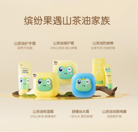 青蛙王子山茶油保湿面霜矩阵覆盖多元需求,是品牌山茶油面霜矩阵的核心单品,添加 10% 自研的专利山茶油,核心原料产自武夷山 自有有机山茶树种植基地。通过专利复配工艺打造的 Oil-Coclb 山茶油,复刻陈化山茶油组分配比保湿因子,功效对标自然陈化 15 年的山茶油精粹,能深层滋养肌肤,实现 48 小时动态保湿舒缓,直击干燥根源,有效舒缓肌肤敏感泛红不止补水更能长效锁水。同时搭配专利小球藻、定制 FCC 茶护因子(含专利丝心蛋白)三重专利活性精粹,专利小球藻能深层净化肌肤,持久补水保湿;FCC茶护因子运用先进蛋白锁油技术,丝心蛋白形成的海绵状空腔将Oil-Coclb油滴牢牢锁住、稳定包裹,避免油脂直接暴露在皮肤表面被氧化,杜绝宝宝“小黑脸”,同时肤感清爽丝滑,亲肤性与功效性兼备,改善干燥反复、换季敏感问题,强韧修护儿童脆弱肌肤屏障。宝宝爱用,妈妈安心。