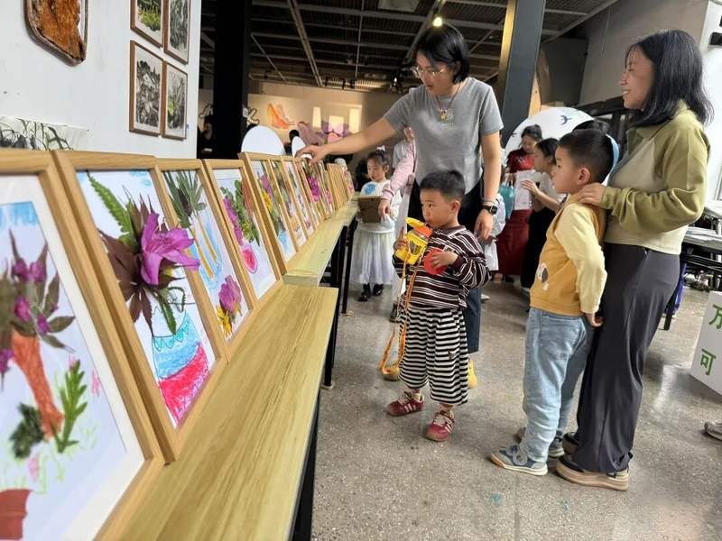 在树叶拓印手工创作环节,孩子们在家长协助下,小心翼翼地将叶脉纹理拓印于画纸上。一枚枚落叶化作跃然纸上的春天印记,孩子们专注的神情与完成作品后的喜悦,定格了“把春天带回家”的美好瞬间。