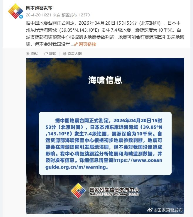 新京报讯 据国家预警发布官博消息,据中国地震台网正式测定,2026年04月20日15时53分(北京时间),日本本州东岸远海海域(39.85°N,143.10°E)发生7.4级地震,震源深度为10千米。自然资源部海啸预警中心根据初步地震参数判断,地震可能会在震源周围引发局地海啸,但不会对我国沿岸造成影响。