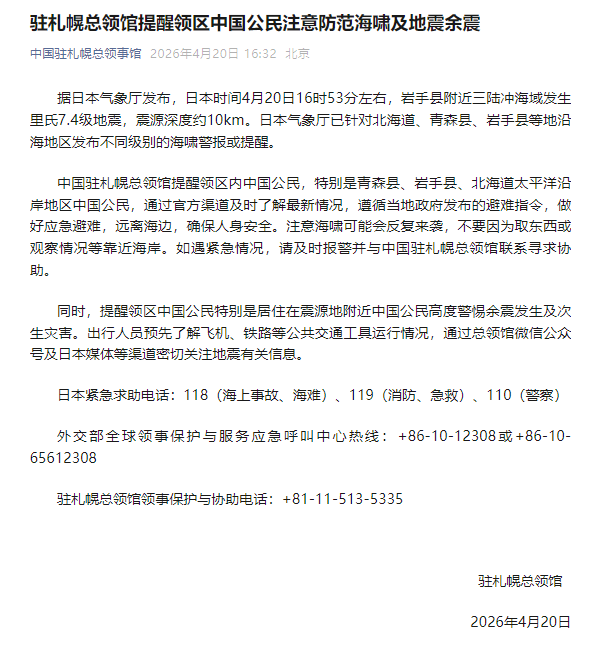 新京报讯 据中国驻札幌总领馆消息,据日本气象厅发布,日本时间4月20日16时53分左右,岩手县附近三陆冲海域发生里氏7.4级地震,震源深度约10km。日本气象厅已针对北海道、青森县、岩手县等地沿海地区发布不同级别的海啸警报或提醒。