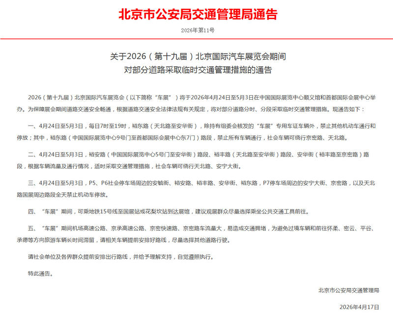 新京报讯 据北京市公安局交通管理局消息,2026(第十九届)北京国际汽车展览会(以下简称“车展”)将于2026年4月24日至5月3日在中国国际展览中心顺义馆和首都国际会展中心举办。为保障展会期间道路交通安全畅通,根据道路交通安全法律法规有关规定,将对部分道路分时、分段采取临时交通管理措施。现通告如下: