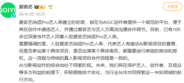 新京报讯 4月20日,爱奇艺官博发文,内容如下: