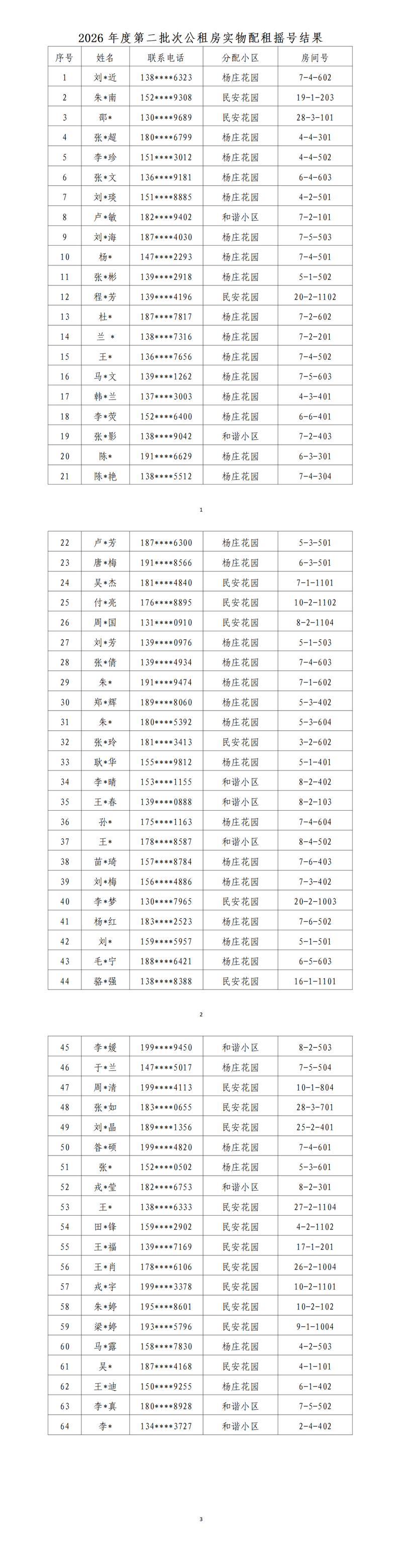 根据《阜南县保障性住房分配和管理实施办法(试行)(南政发〔2019〕27号)》规定,经前期审核后,我单位于2026年4月21日上午在民安花园保障房小区对64户符合条件的公租房申请人进行了2026年度第二批次公租房实物配租公开摇号,现将摇号结果予以公示,公示期内接受相关举报、反映。