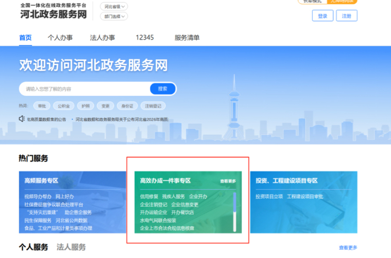 ①个人登录河北政务服务网(http://www.hbzwfw.gov.cn)→找到“高效办成一件事专区”,进入专区页面。