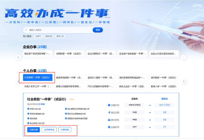 ②在“高效办成一件事专区”个人事项中找到社会救助“一件事”,可查看办事指南→点击“立即办理”,选择对应地区,即可在线申报。