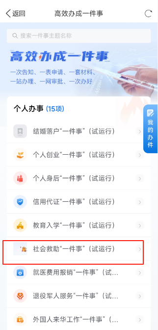 ①个人下载、登录“冀时办”App,点击“高效办成一件事”专区→在“个人办事”区域选择社会救助“一件事”。