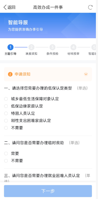②点击“立即办理”进行申报→选择对应地区,根据个人实际情况,完成信息填报。按填报步骤准备好并上传以下材料:居民身份证;居民户口簿(外地户籍人员需提供新区居住证);家庭经济状况核对授权书(在线申请时可以看到下载途径);家庭困难证明材料(教育、就医等刚性支出凭证、残疾证等)等。