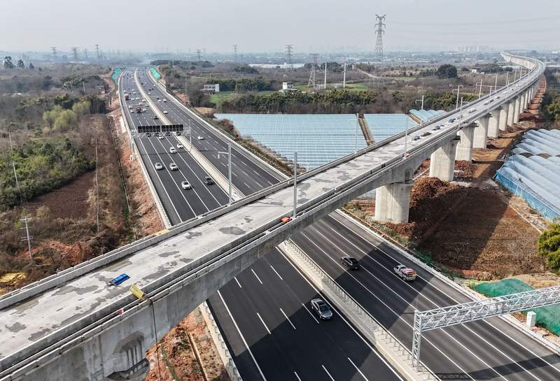2月10日,成渝中线高铁四川段桥梁建设全部完成。这是当日在成都市拍摄的成渝中线高铁最长桥梁龙泉特大桥跨沪蓉高速公路(无人机照片)。新华社记者王曦 摄
