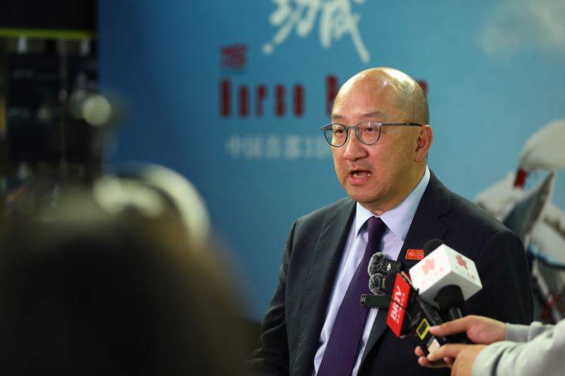 香港赛马会公司事务执行总监谭志源在展映活动现场接受采访。