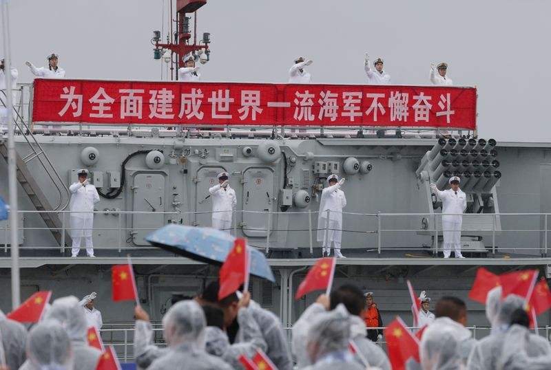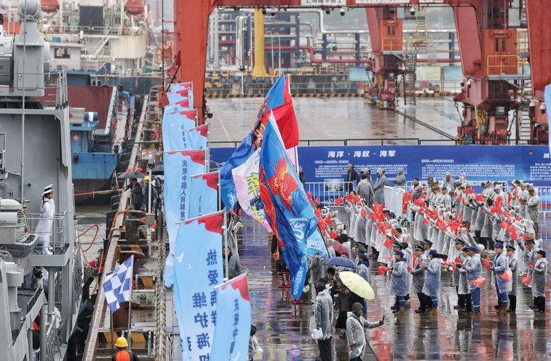 甲板上,水兵分区列阵,右手齐眉敬礼。码头上,党政领导、退役军人及各界群众手持国旗,高呼“欢迎回家”。