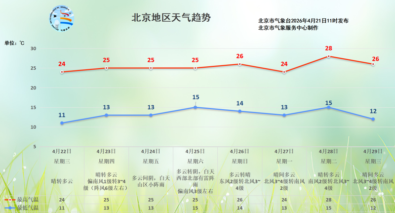 目前来看,预计4月23日至26日以晴到多云为主,气温比较平稳,但午后多五级左右偏南阵风。另外,本周六白天西部北部还有雷阵雨天气,请提前关注临近预报,并做好出行计划。
