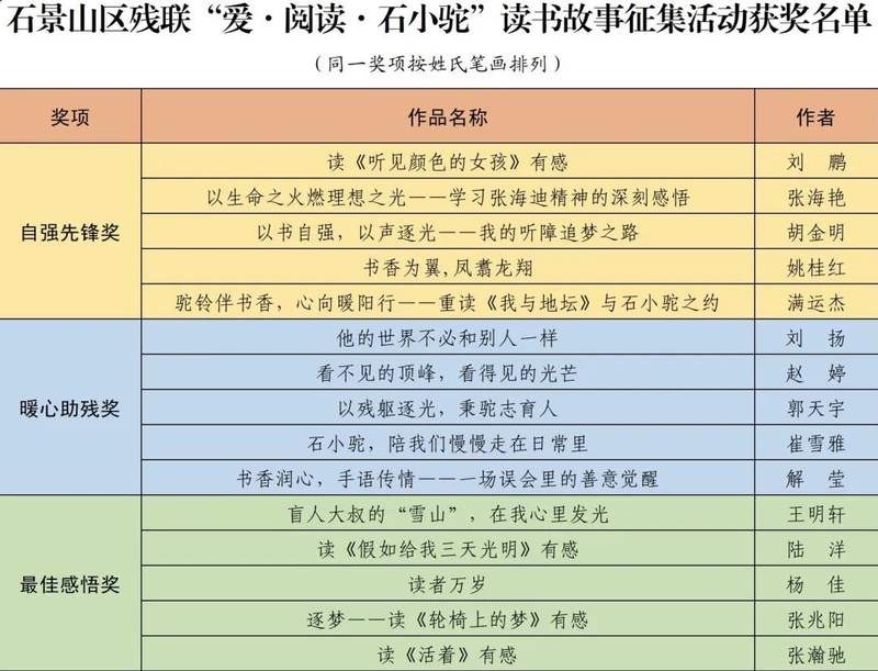 由石景山区残疾人联合会举办的“爱・阅读・石小驼”读书故事征集活动自启动以来,得到了社会各界的广泛关注与积极响应。广大残疾人朋友及其亲属、残疾人工作者、志愿者及市民朋友们踊跃投稿,用真诚的文字与温暖的声音记录自强故事、讲述助残事迹、分享读书感悟,让“石小驼”承载的温暖与力量不断延续,为石景山区残疾人文化事业注入新的活力与温度。