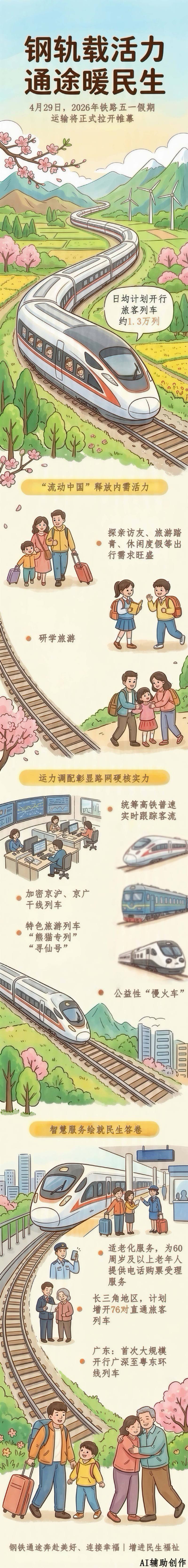 4月29日,2026年铁路五一假期运输将正式拉开帷幕。据介绍,2026年五一假期铁路运输期限自4月29日起至5月6日止,为期8天,日均计划开行旅客列车约1.3万列,铁路客流将保持高位运行。数字里,有“流动中国”的韧性和活力,有百姓畅行的暖意和通途,更彰显了中国铁路在服务民生需求、支撑经济发展、助力区域协同中的时代担当。
