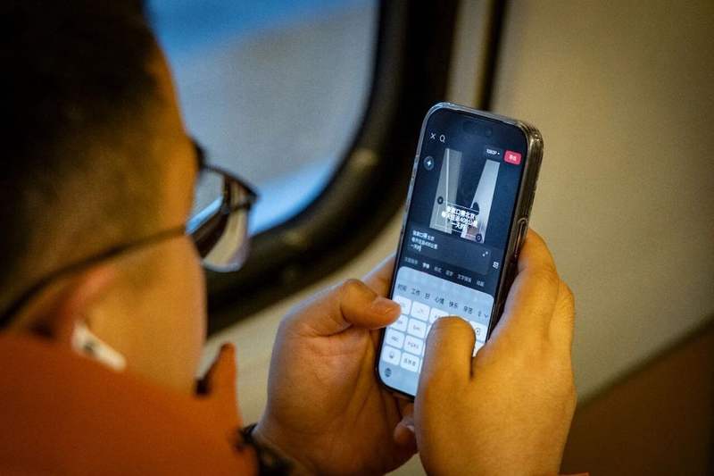 张家口开往北京北的高铁上,李橙子用手机拍摄通勤视频。