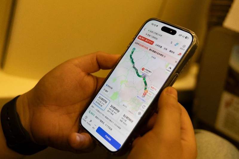 北京北开往张家口的高铁列车上,李橙子用手机地图展示每天通勤路线。