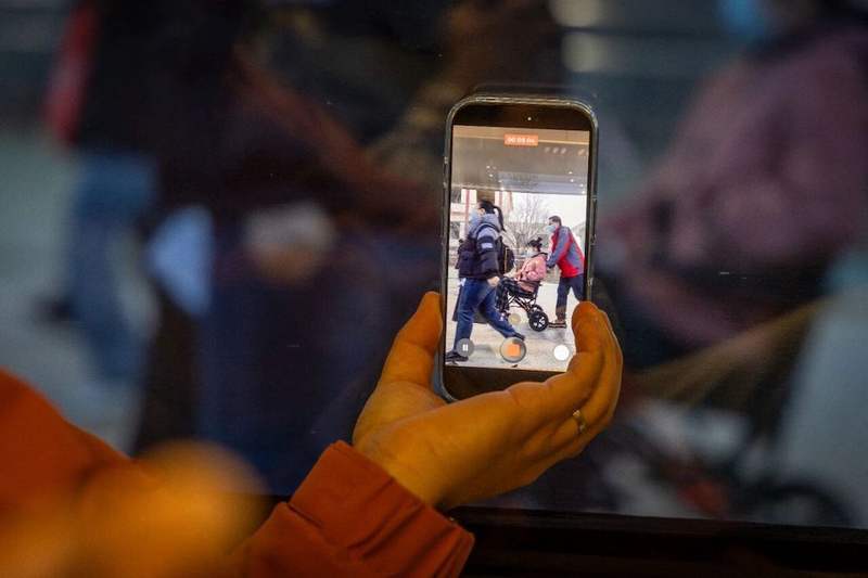 3月20日清晨,张家口,李橙子上高铁后用手机拍摄通勤素材。这趟早班高铁上,除了像他一样往返京张的上班族,还有不少提着病历、推着轮椅前往北京看病的旅客。