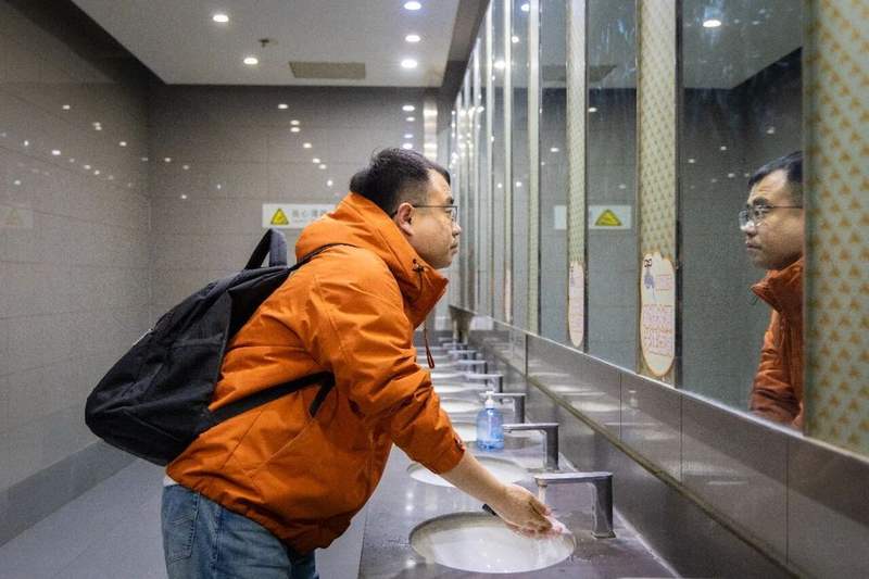 发车前,李橙子在张家口站卫生间稍作整理,初春清晨里,温热的自来水带来一丝暖意。
