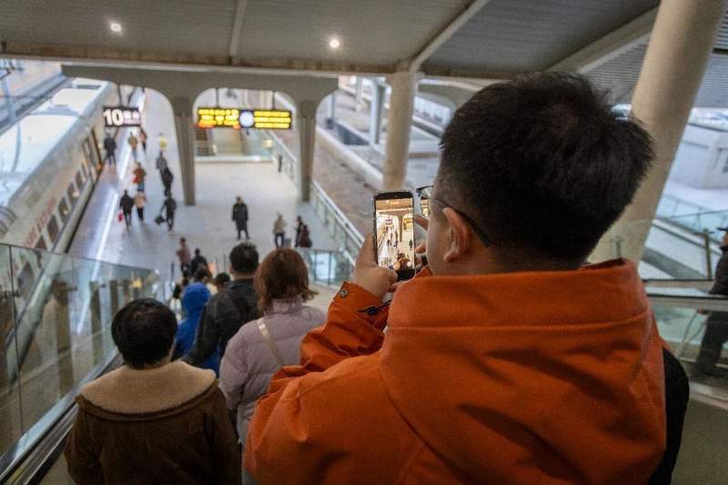 李橙子乘坐自动扶梯前往张家口站站台,途中用手机拍摄通勤视频素材。