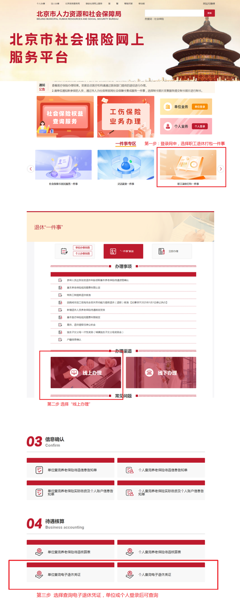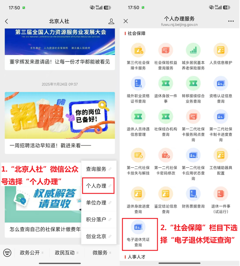 手机端申领渠道:关注北京人社公众号,在微服务-个人办理-社会保障-电子退休凭证查询,查看《北京市电子退休凭证》。