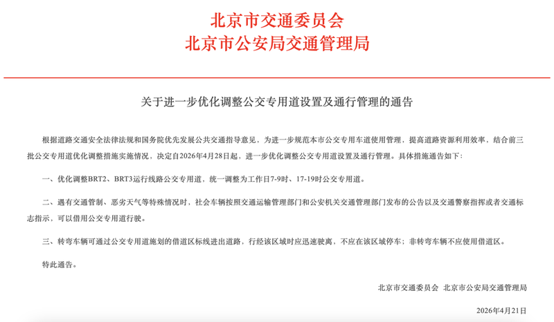 根据道路交通安全法律法规和国务院优先发展公共交通指导意见,为进一步规范本市公交专用车道使用管理,提高道路资源利用效率,结合前三批公交专用道优化调整措施实施情况,决定自2026年4月28日起,进一步优化调整公交专用道设置及通行管理。