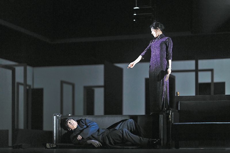 不仅如此,全剧的开场与结尾、结构与角色出场方式,均带有强烈的循环往复感。鲁侍萍的登场被拆解为多次,随着周朴园的回忆,年轻与年老的鲁侍萍在舞台深处的门框间交替闪现。当周朴园提及那件绣着梅花与“萍”字的旧衬衣时,在曹禺原有台词之外,新增了一段鲁侍萍想象中周朴园的回忆性独白,想象里深情款款的周朴园,与现实对话中冰冷多疑的他形成鲜明对比。两段话语参差对照,伴随着舞台上空悬置的旧家具起落,将30年的爱恨恩怨更为具象地呈现在观众眼前。