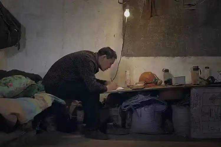 2014年冬天,陈年喜在矿山工棚里写作。(受访者供图)