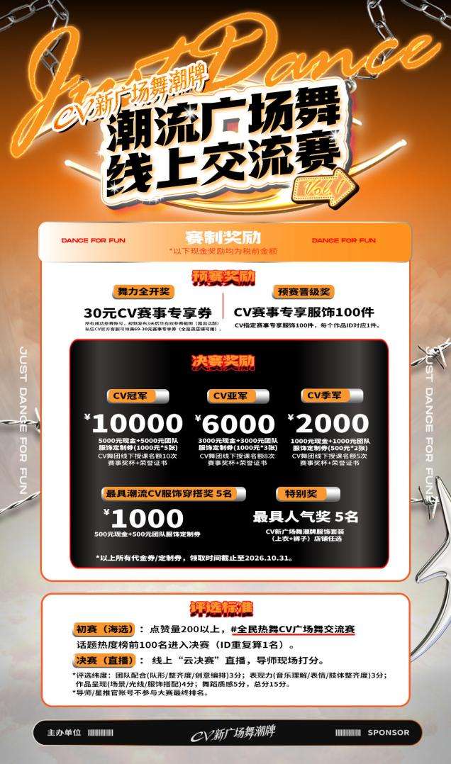 同时,赛事联动CV新广场舞潮牌,结合六大博主的服饰带货优势,为舞者提供专属穿搭福利与健身好物,打造“教学+交流+穿搭+健身”的广场舞全生态,让广场舞不仅能带来快乐,更能赋能美好生活。