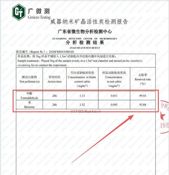 除醛实力有权威检测数据保驾护航,产品特别添加高碘值椰壳活性炭粉(碘吸附值≥1021mg/g),与纳米矿晶科学合成后,经具备CMA/CNAS双重资质的广东省微生物分析检测中心检测(报告编号:2026FM00193R01D),24小时甲醛去除率高达99.03%,苯去除率达93.88%,净化效果远超行业平均水平。