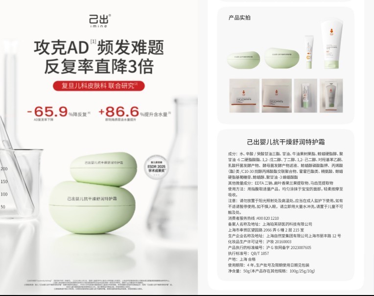 己出是复旦儿科医院与自然堂集团医研共研成果,双方联合成立婴童皮肤健康联合研究中心。其专利成分“复儿爱倍健”入选30+皮肤学专家认证的《儿童特应性皮炎非药物干预管理专家共识》,并获得国内首个0-6岁婴童湿疹降反复临床报告。产品还斩获欧洲皮肤学会学术成果大奖,临床研究证实,使用其特护霜能显著降低患儿特应性皮炎复发率。