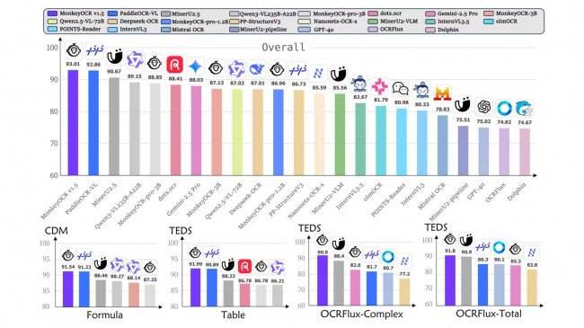 面对三大核心痛点,金山办公坚持从办公场景出发、为办公场景而生,两年内完成Monkey 模型四次技术跃迁。值得一提的是,MonkeyOCR v1.5在全球权威文档解析评测榜单OmniDocBench V1.5中拿下93.01分的成绩,获得综合性能全球第一。