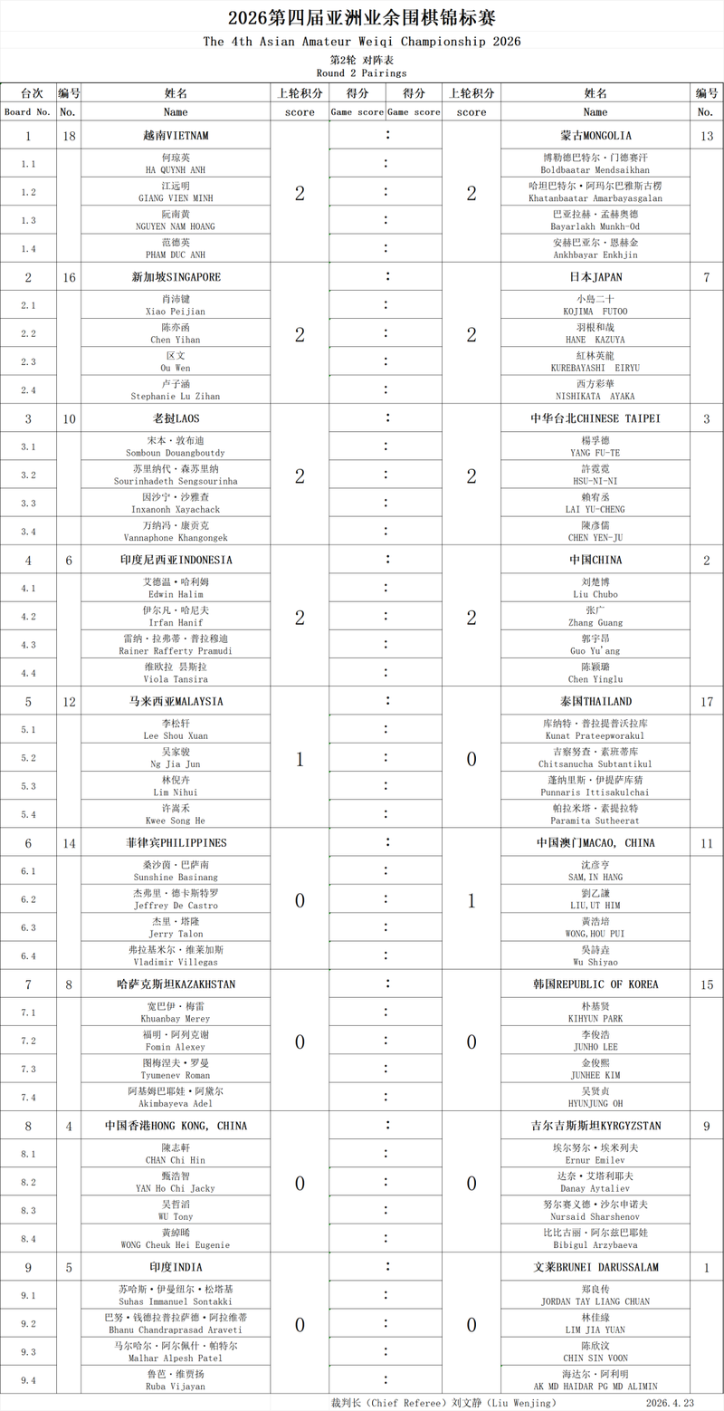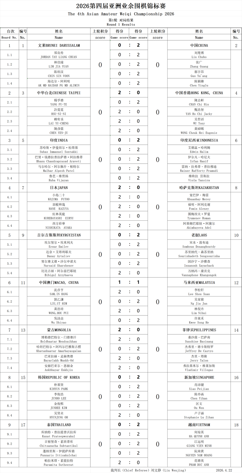 北京时间4月22日晚19:30,由中国围棋协会主办的2026第四届亚洲业余围棋锦标赛在野狐围棋平台正式拉开帷幕。