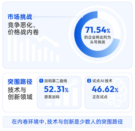 调研显示,71.54%的企业将“市场竞争恶化、价格战内卷”列为头号挑战。但与此同时,52.31%的企业正在加码第二曲线,46.62%已启动AI试点。白皮书指出,在同质化竞争持续加剧的环境下,技术升级与创新投入正在成为企业实现差异化突围的重要路径。