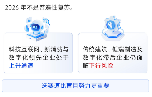 科技互联网、新消费及数字化领先企业正在进入上升通道,而传统建筑、低端制造及数字化转型滞后企业仍面临较大下行压力。白皮书认为,2026年的恢复并非普遍性修复,而是结构性修复,企业所处赛道与转型能力的重要性显著提升。