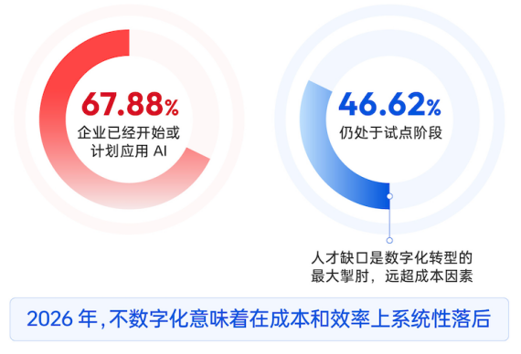 数据显示,67.88%的企业已开始或计划应用AI,但其中46.62%仍处于试点阶段。值得关注的是,企业普遍反馈,人才缺口已成为数字化转型的首要制约因素,影响程度明显高于成本投入。白皮书指出,未来数字化能力差距将进一步转化为成本效率差距。