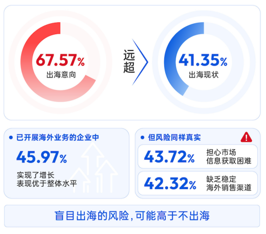 67.57%的企业表达出海意向,显著高于41.35%的实际落地比例;已开展海外业务的企业中,45.97%实现增长,整体表现优于平均水平。与此同时,市场信息获取困难与海外销售渠道不足,仍是企业出海的主要障碍。白皮书提示,全球化布局需要建立在路径选择与资源准备充分的基础之上。