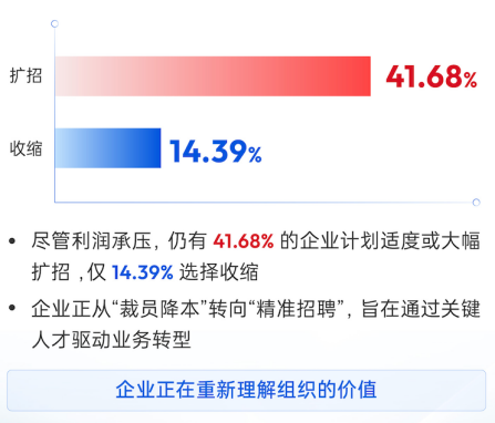 尽管利润仍有压力,仍有41.68%的企业计划适度或大幅扩招,仅14.39%选择收缩团队。企业在人力资源上的策略,正由传统降本逻辑,转向围绕关键岗位、数字化人才和转型型人才的精准投入。