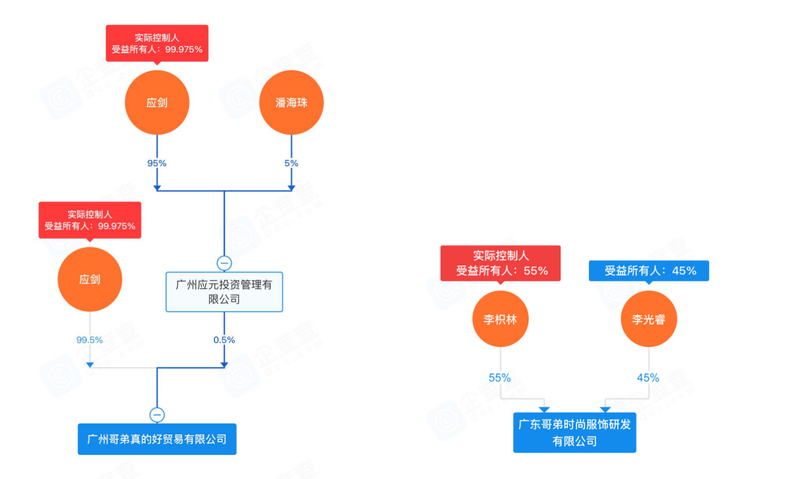 真正的转折出现在2022年前后,企查查信息显示,目前广州哥弟真的好贸易有限公司已由应剑实际控制,其持股比例达99.5%。