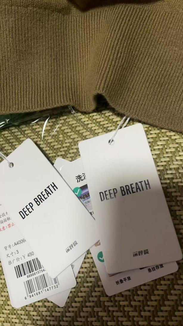 4月20日,记者在深呼吸天猫旗舰店随机购买的几件商品,实际吊牌均为“深呼吸”。
