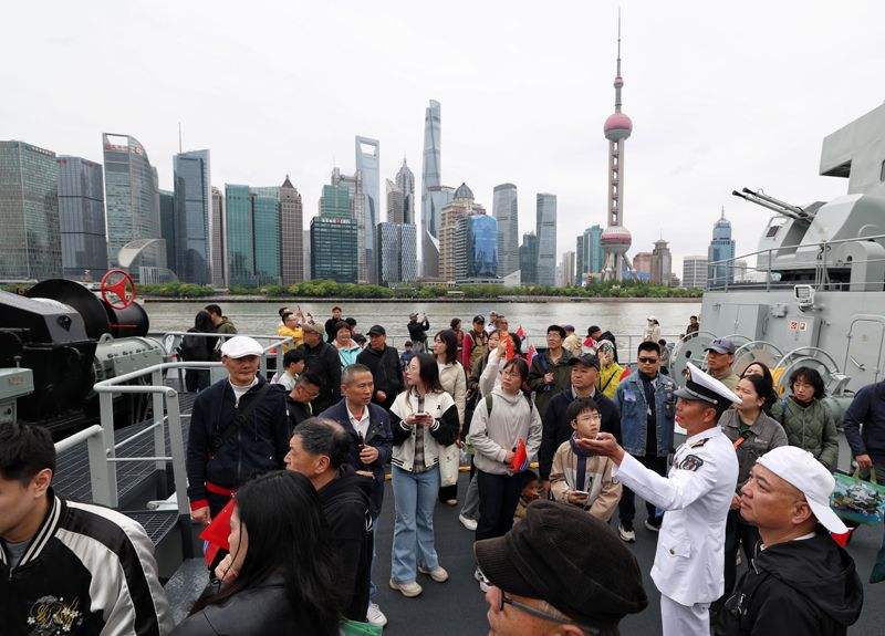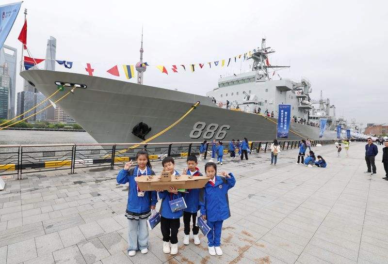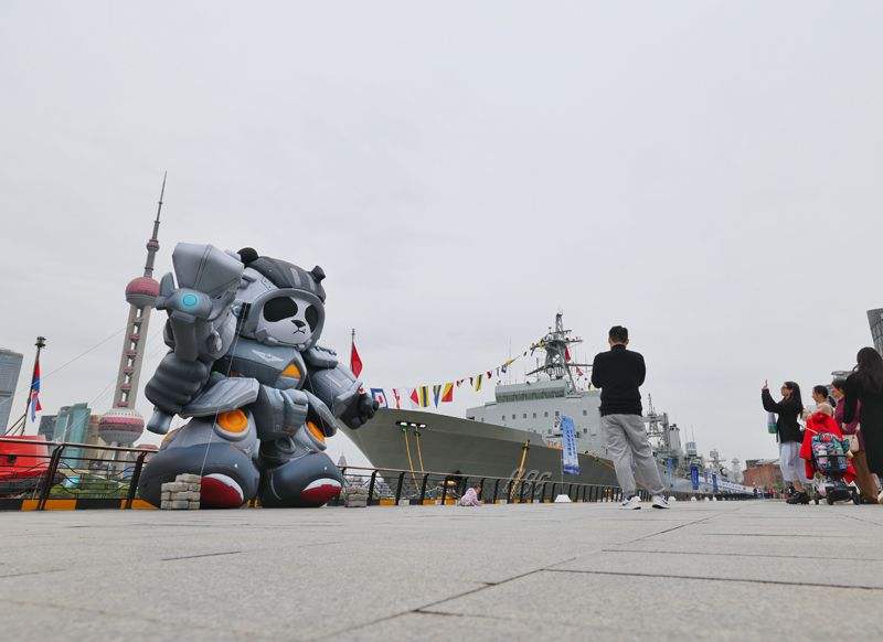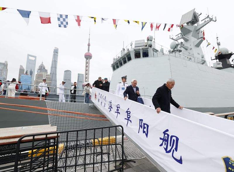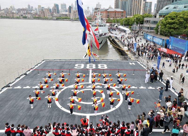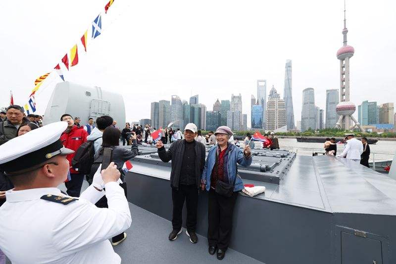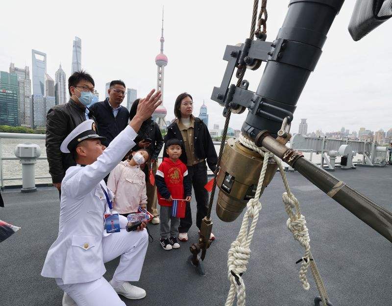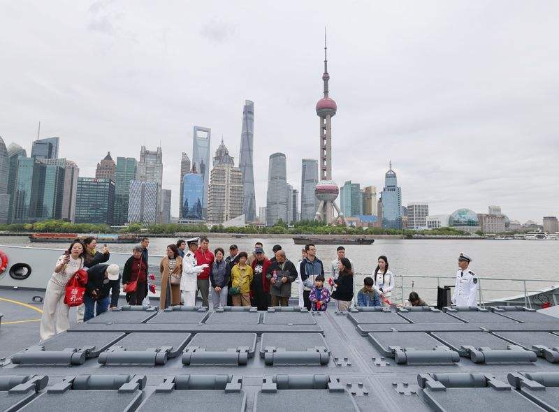以“上海·海上”为主题的舰艇开放活动4月21日在上海港国际客运中心码头启幕。海军阜阳舰、海军千岛湖舰悬挂满旗,迎接各界群众登舰参观。这是该主题活动第三次与上海地标同框亮相,吸引了大批市民前来参与。