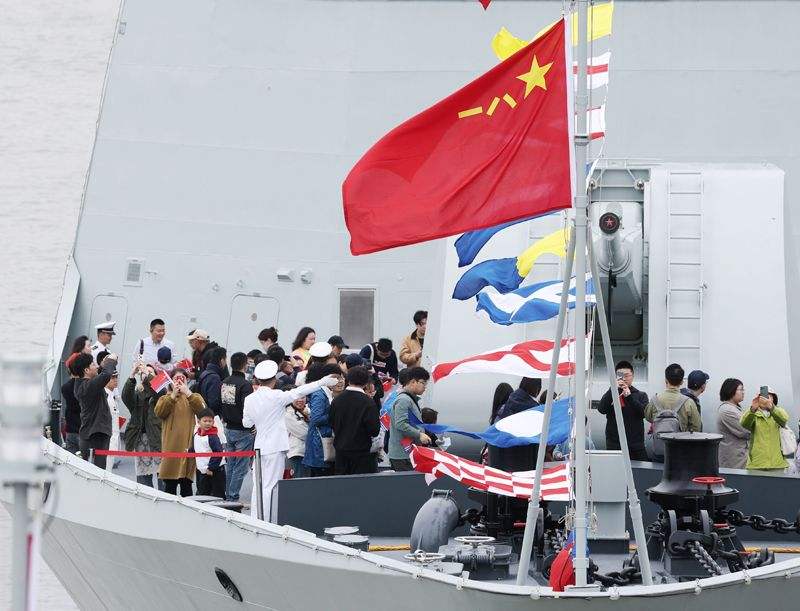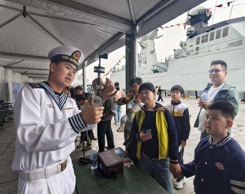 甲板上、舰舷边,众多市民驻足留影。孩子们兴奋地触摸装备,老人们凝神倾听讲解,大家在沉浸式参观体验中感受国防强大、厚植爱国情怀。