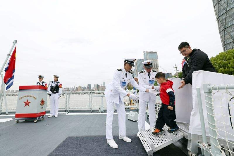 在海军官兵的引导下,参观群众依次登上舰艇,近距离观摩舰载装备、了解舰艇性能,聆听官兵讲解海军建设发展与执行任务的故事。