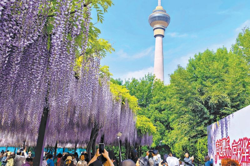 据玉渊潭公园宣传科科长张轩介绍,为提升游客观赏体验,公园在紫藤花廊下增设了多处休憩座椅,并在赏花高峰时段安排职工和志愿者引导客流,帮助游客打卡拍照,开展紫藤科普讲解。