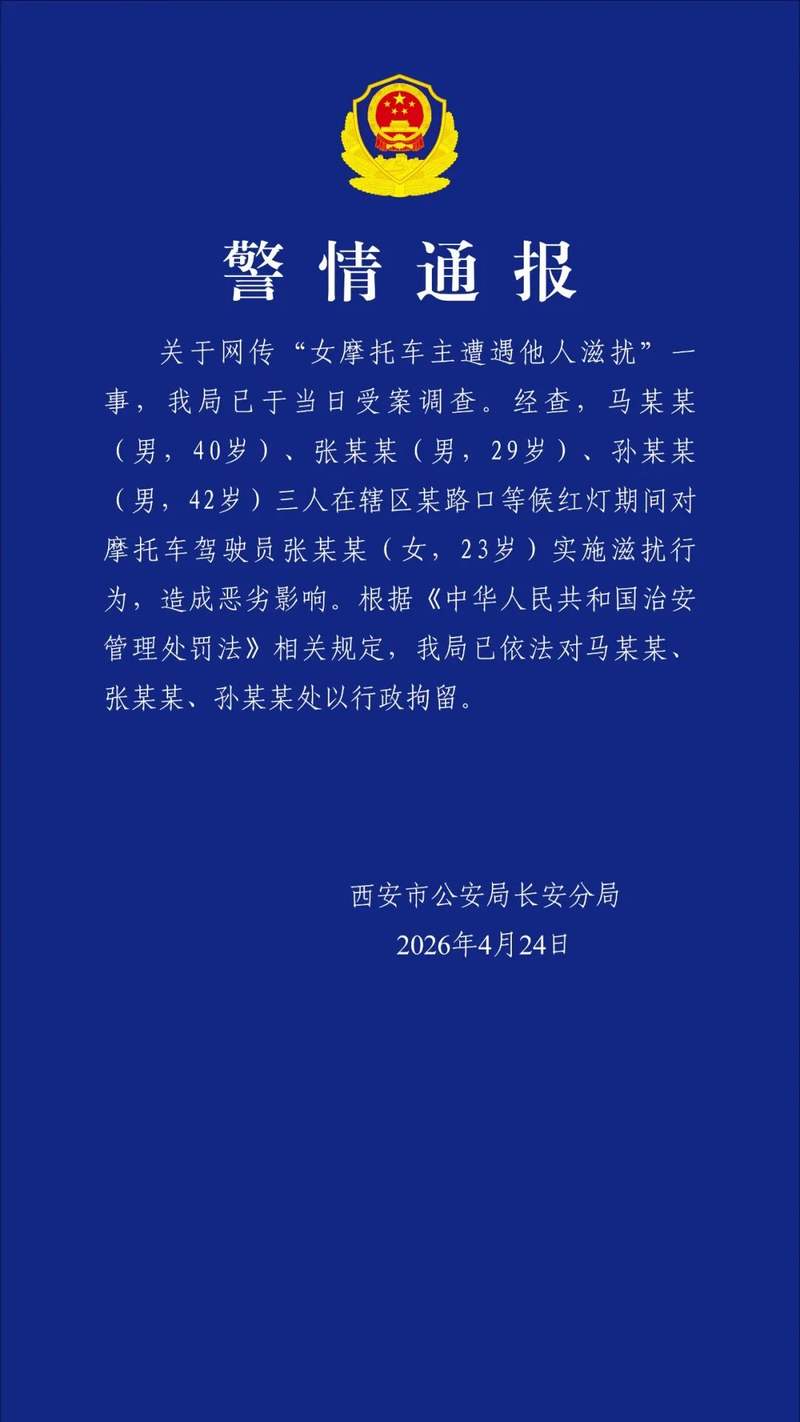 新京报讯 西安市公安局长安分局4月24日发布警情通报:编辑 毛天宇 14 +1 微博 微信 我要评论 登录 直播 直播中 直播丨国新办介绍《中国打击侵权假冒工作年度报告》有关情况 1400人参与 直 播 直播丨全球最大规模车展来了!记者双馆连播探访亮眼的首发车 2494人参与 预 告 浪漫日出丨追光海盐慢直播 2026-04-30 05:00 预 告 “人工智能+”进行时——从技术竞速到场景深耕 2026-04-24 14:00 热点 1 日本允许杀伤性武器出口,“打破日本数十年来的和平承诺” 3.2万 2 西城区启动“阅读春天”系列活动 2.9万 3 安波福杨晓明:中国团队需要从心态上思考如何领导全球研发 2.8万 4 奔驰举行品牌日,纯电GLC SUV全球首秀 2.4万 5 视频|人民海军成立77周年,阜阳舰亮相上海开放参观 2.4万 最新 国际丨华盛顿一公交车隧道内起火瞬间传巨响 黑烟弥漫国会山上空 2分钟前 五一相遇北京,北京市文旅局联合新京报为你解锁京城深度游攻略 3分钟前 北京第三实验学校配套道路完工 9分钟前 工信部:我国3月户均流量23.4GB创新高 9分钟前 江西省卫生健康委员会原党组书记、主任龚建平被“双开” 9分钟前 热议 视频|人民海军成立77周年,阜阳舰亮相上海开放参观 视频|从昼到夜!阜阳舰、千岛湖舰与外滩共绘壮美画卷 日本福岛核事故反应堆内部测得“极高”水平核辐射 视频|庆祝人民海军77周年 上海市民零距离感受国之重器 新闻8点见丨北京国际车展今天开幕;19岁大学生疑被卖缅甸园区